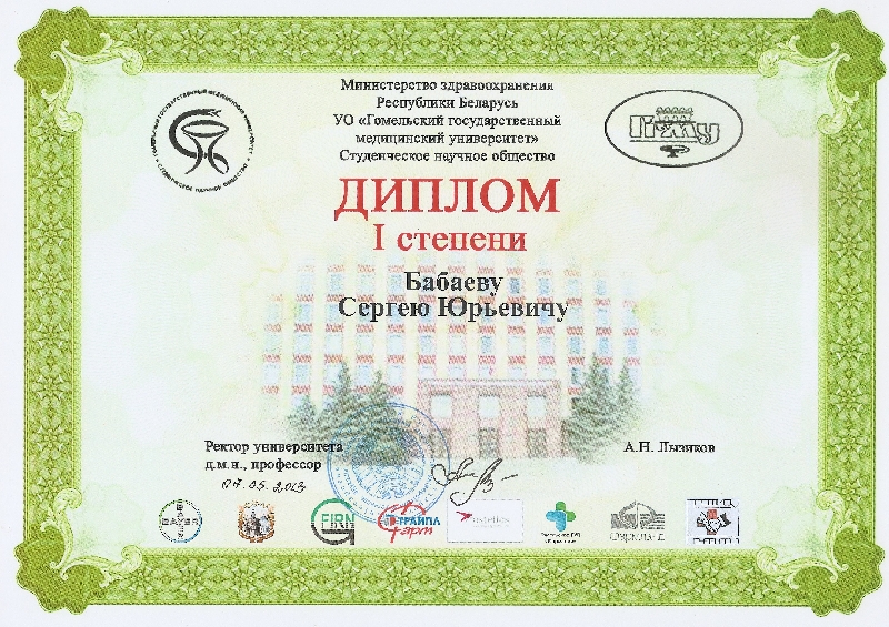 Поздравляем студента гр.10лл4 Бабаева С.Ю. с дипломом I степени на V Республиканской научно-практической конференции c международным участием студентов и молодых ученых «Проблемы и перспективы развития современной медицины».
